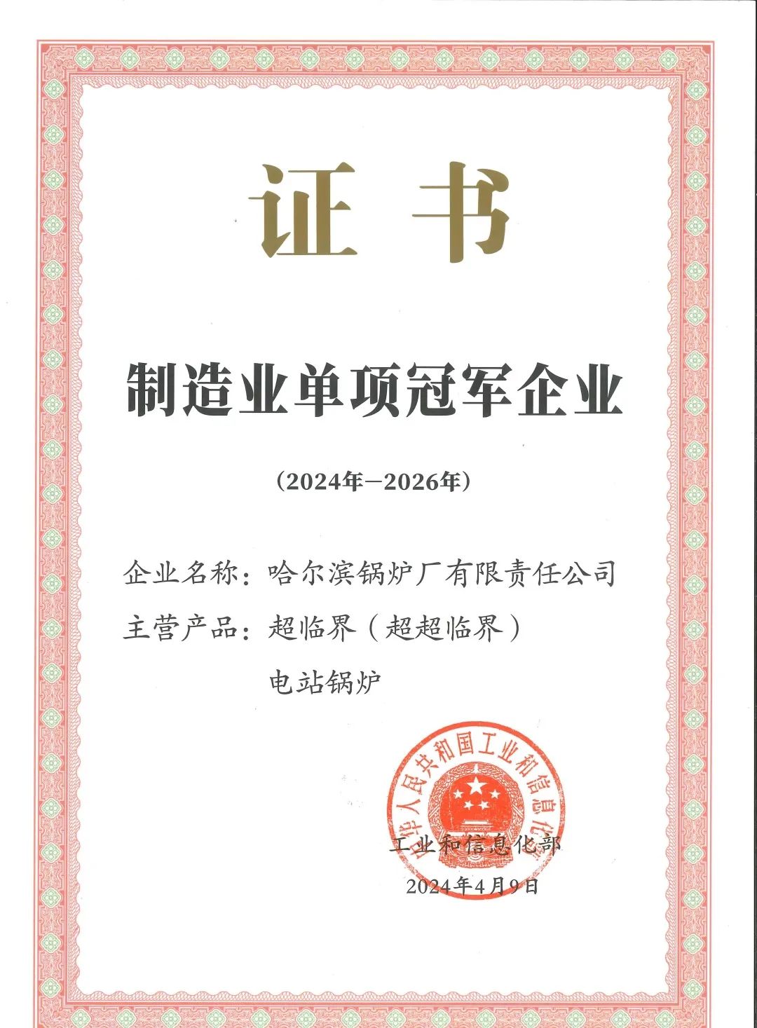 2024年,哈電集團鍋爐公司超臨界(超超臨界)電站鍋爐榮獲制造業單項冠軍企業。
