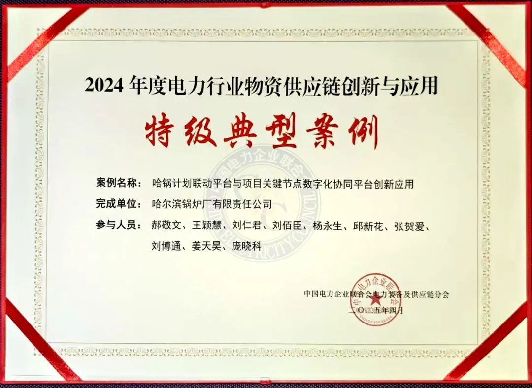 鍋爐公司一項目獲評2024年度電力行業物資供應鏈創新與應用特級典型案例