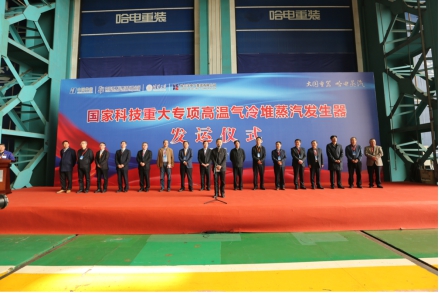 驗收會后,哈電集團黨委書記、董事長斯澤夫與中國華能黨組成員、副總經理葉向東共同為“大國重器”揭幕,各方代表分別致辭,對國家科技重大專項全球首臺高溫氣冷堆蒸汽發生器研制成功并順利通過驗收表示祝賀。
